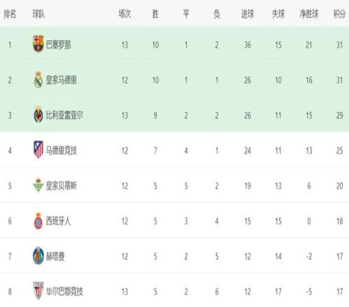 在積分榜上,巴薩暫時超越皇馬登頂。巴薩10勝1平2負(fù),拿到31分?;蜀R也是31分,但是凈勝球比巴薩少,只能排名第2。不過,皇馬比巴薩少踢1場,接下來有機會重新登頂。比利亞雷亞爾以29分排名第3,與巴薩皇馬的差距很小。馬競以25分排名第4。第5的是皇家貝蒂斯,拿到了20分。西班牙人以18分排名第6。赫塔費和畢爾巴鄂競技都是17分。塞維利亞和皇家社會只拿到16分。