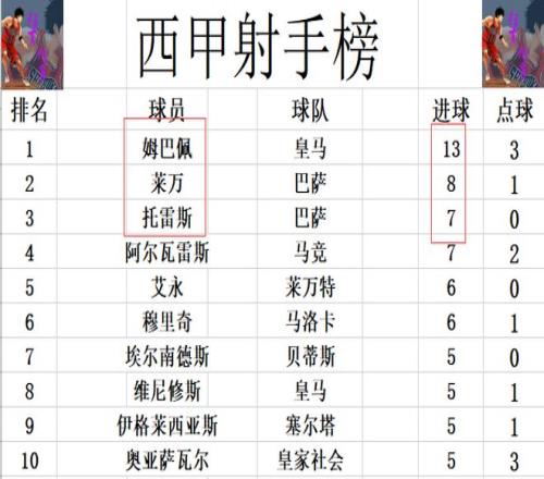 射手榜方面,姆巴佩12輪打入13球高居榜首,萊萬今天閃擊破門繼續(xù)追趕,8球獨居第2。托雷斯梅開二度追上阿爾瓦雷斯,兩人7球并列第3。維尼修斯,奧亞薩瓦爾等人5球剛好擠入前十。
