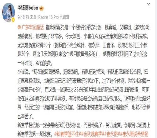 她寫(xiě)道:小崔在沒(méi)有完全康復(fù)的情況下順利完成體測(cè),這一年他真的沒(méi)有浪費(fèi),這位22歲的球員發(fā)出最真摯的感悟,可見(jiàn)他之前真的經(jīng)歷非常多。