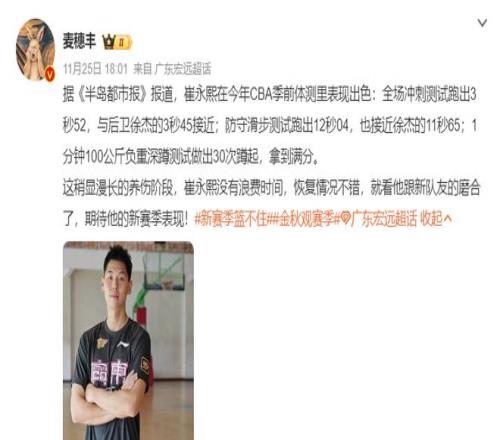 從目前爆料的一些數(shù)據(jù)能看出崔永熙的恢復(fù)狀態(tài)非常好,CBA外線(xiàn)投籃測(cè)試,崔永熙25中16,比王睿澤還出色,徐杰26中21,郭艾倫是25中15。