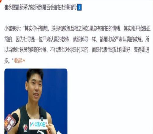 崔永熙也談到了杜鋒、楊瀚森等人的話(huà)題,但他最多的還是談自己身體情況,他表示自己會(huì)努力康復(fù)爭(zhēng)取趕上CBA新賽季的第一場(chǎng)比賽,他還表示一開(kāi)始害怕杜鋒指導(dǎo)屬于正常情況。