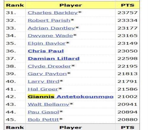 值得一提的是,目前的NBA總得分王是詹姆斯,他得到了42250分;而字母哥目前得到了21002分,僅排名第42位。