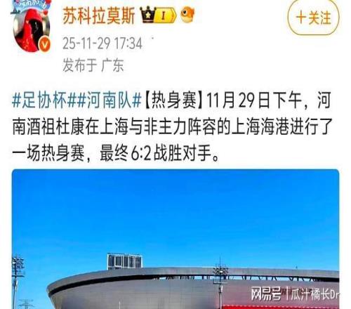 北京時間11月30日,一條來自媒體人“蘇科拉莫斯”的消息悄悄在足球圈傳開——正在上海集訓、緊鑼密鼓準備足協(xié)杯決賽的河南隊,居然在熱身賽里踢了個大比分出來。他們做客上海海港主場,硬生生送了中超冠軍一個6比2。消息一出,不少球迷第一反應(yīng)是懵的:河南隊這么猛?把新科冠軍打成這樣?
