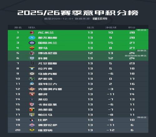 北京時間12月1日,2025/26賽季意甲聯(lián)賽結(jié)束了第13輪的較量,積分榜的形勢依然十分膠著。