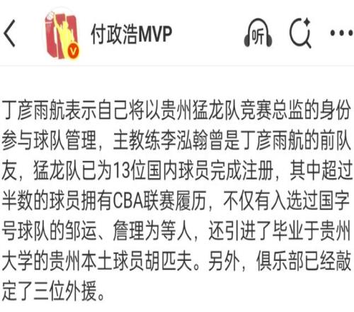 根據(jù)媒體介紹,丁彥雨航是球隊的聯(lián)合創(chuàng)始人,另一位合作人是前廣州龍獅的老總林葳,而球隊主帥則是CBA名將,丁彥雨航昔日在山東男籃的隊友李泓翰,新賽季貴州猛龍的目標就是沖擊聯(lián)賽四強,為此他們也引進了三名外援。