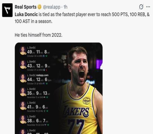 第八項(xiàng):東契奇開季15場拿到至少500分100助攻100籃板追平22年的自己并列歷史最快;