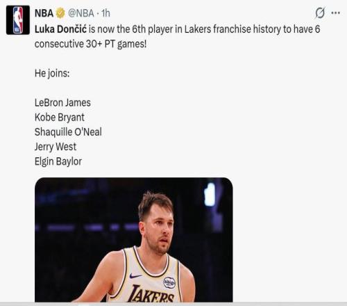 第九項(xiàng):東契奇連續(xù)6場砍下30+,成為湖人隊(duì)史第六人,前五人分別是詹姆斯、科比、奧尼爾、韋斯特和埃爾金-貝勒。