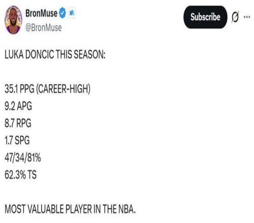面對東契奇這樣的表現(xiàn),湖人媒體BronMuse也曬出數(shù)據(jù)點(diǎn)評道:“聯(lián)盟最有價值球員?!?/p>