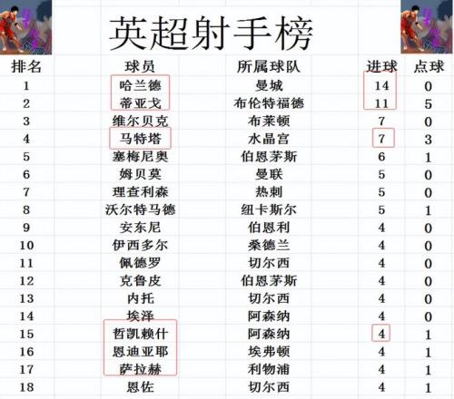 射手榜方面,哈蘭德14球領(lǐng)跑,蒂亞戈11球緊隨其后,馬特塔今天點(diǎn)射建功,追上維爾貝克,兩人7球并列第3,塞梅尼奧6球排第5。哲凱賴什復(fù)出沒有進(jìn)球,還是和埃澤,薩拉赫,恩佐等人4球剛好擠入前十。