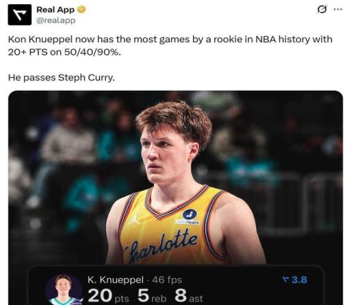 要知道新賽季場次還未過半,克努佩爾就已經(jīng)超過庫里,按照目前的勢頭來看,他勢必大幅刷新庫里保持的這一項NBA歷史神紀(jì)錄,也將威脅庫里手中保持的數(shù)項有關(guān)新秀的三分投射紀(jì)錄。