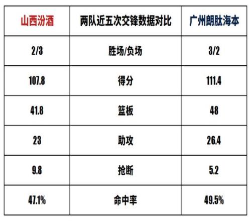 山西汾酒與廣州朗肽海本歷史上一共交手44次,山西汾酒23勝21負。上賽季兩隊交手2次,山西汾酒2勝0負。