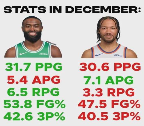 很多球迷為布朗鳴不平,認為他應(yīng)該是東部月最佳。12月份尼克斯10勝4負,勝率71.4%;凱爾特人9勝3負,勝率75%。杰倫-布朗12月份場均31.7分5.4助攻6.5籃板,投籃命中率53.8%、三分命中率42.6%。其中場均得分領(lǐng)跑聯(lián)盟。