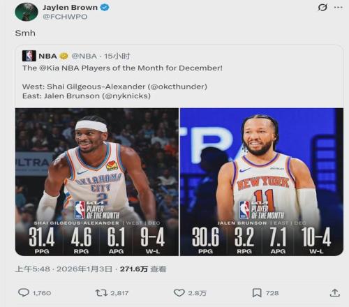 NBA官方公布12月份的月最佳球員,布倫森當選東部月最佳,亞歷山大當選西部月最佳。凱爾特人球員杰倫-布朗轉(zhuǎn)發(fā)這則報道,并表示不理解。此后布朗在直播中還說道:“無意冒犯亞歷山大和布倫森,但他倆這月的表現(xiàn)都不如我?!?/p>