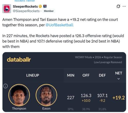 開賽至今,當(dāng)伊森首發(fā)出戰(zhàn)時(shí),火箭隊(duì)5戰(zhàn)全勝,伊森與阿門同時(shí)在場時(shí),進(jìn)攻效率126.3聯(lián)盟第一,107.1的防守效率聯(lián)盟第二,凈效率高達(dá)+19.2。