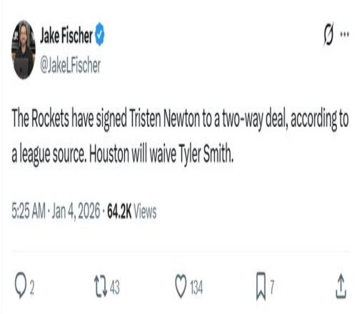 根據(jù)記者Jake Fischer報(bào)道,火箭隊(duì)完成一簽一裁,與后衛(wèi)特里斯滕-牛頓簽下雙向合同,并為其裁掉前鋒泰勒-史密斯騰出位置。