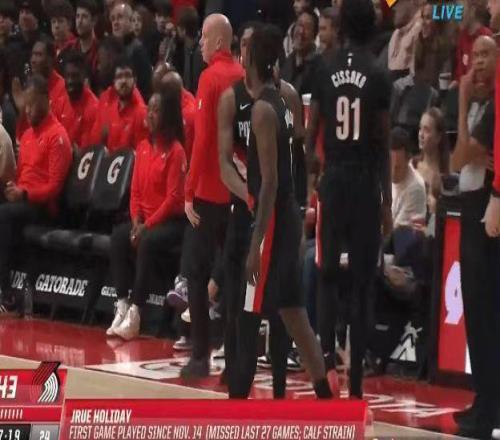 開拓者后衛(wèi)霍勒迪連續(xù)傷停27場(chǎng)后復(fù)出替補(bǔ)登場(chǎng)。