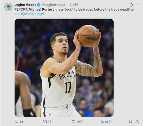 NBA名記John Hollinger報(bào)道,小邁克爾-波特在交易截止(2.6)日前被籃網(wǎng)送走是板上釘釘?shù)氖?,籃網(wǎng)想要趁著小波特打出生涯最佳表現(xiàn)時(shí),實(shí)現(xiàn)交易價(jià)值最大化。目前勇士、活塞和雄鹿都表達(dá)了興趣,其中最積極的就是勇士隊(duì)。