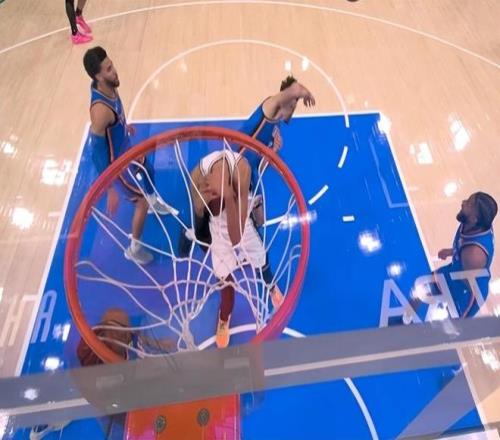 本來這球文班這個(gè)位置搶下前場(chǎng)板,可以直接發(fā)動(dòng)進(jìn)攻了,可是沒想到亞歷山大又來了一個(gè)新動(dòng)作,叫夾腿動(dòng)作,這個(gè)動(dòng)作非常兇狠,夾著你的腿,那你能動(dòng)嗎?這種夾腿直接把人放倒,我們?cè)谥暗谋荣惱锘旧隙际强床灰姷?,更不要說當(dāng)家核心球員親自去這么干,結(jié)果沒有想到亞歷山大,竟然真的親自去這么干了。對(duì)對(duì)手超巨用剪刀腿,放在哪個(gè)聯(lián)賽里都是不能被允許的。