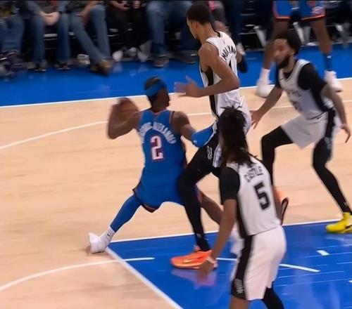 而這竟然只是一個(gè)插曲,一個(gè)序幕,這后面雷霆隊(duì)的大動(dòng)作還層出不窮。因?yàn)榫驮谶@個(gè)回合之后,文班亞馬還遭遇了更狠的動(dòng)作,在雙方比分非常接近,亞歷山大上籃被干擾的情況下,文班拿到籃板,結(jié)果被亞歷山大雙腿夾住腿,當(dāng)場(chǎng)倒在了地上。