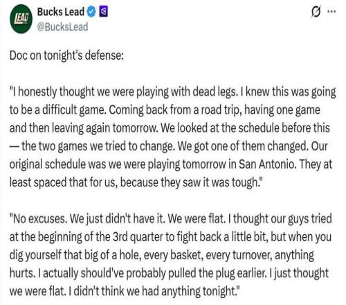 賽后連一向以鼓勵(lì)雞湯著稱的主帥里弗斯都罕見公開吐槽球員,直言自己該早點(diǎn)換下主力球員,他們好像腿都跑不動(dòng)了,攻防兩端完全不在狀態(tài)。