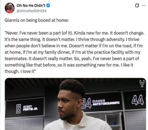 由于接連輸球,字母哥半場(chǎng)結(jié)束時(shí)被自家球迷送上噓聲,下半場(chǎng)字母哥打進(jìn)2+1后又噓了自家球迷做出回應(yīng)。