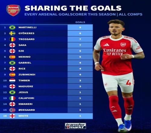 據(jù)統(tǒng)計(jì),本賽季阿森納已有16人收獲進(jìn)球,其中馬丁內(nèi)利以9球領(lǐng)跑,約克雷斯貢獻(xiàn)8球,特羅薩德和各入7球,與梅里諾各有5球入賬,、賴斯、蘇維門(mén)迪均收獲4球,和各進(jìn)3球,、、恩瓦內(nèi)里、以及本·懷特則各有1球進(jìn)賬。