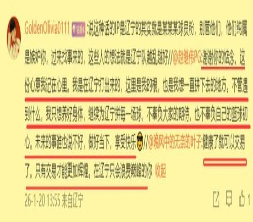 值得一提的是,對(duì)于添亂網(wǎng)友的不實(shí)猜測(cè),遼籃隊(duì)長(zhǎng)趙繼偉毫不客氣地進(jìn)行了駁斥。他說雖然以后的事誰也說不誰,但是任何時(shí)候他都絕對(duì)不會(huì)忘根、忘本,永遠(yuǎn)懷揣著一顆感恩的心,想一直為自己的母隊(duì)遼籃拼下去。