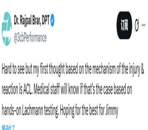 醫(yī)學專家Brar寫道:“雖然看得不太真切,但從受傷動作和他的反應來判斷,我第一反應是前交叉韌帶(ACL)損傷。隊醫(yī)通過徒手拉克曼試驗,就能確診傷情。真心為吉米祈禱,希望他能逢兇化吉?!?/p>