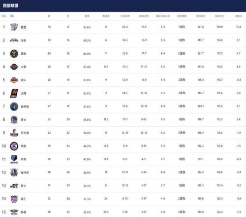 1-3名:雷霆(36勝8負)、馬刺(30勝14負)、掘金(29勝15負)