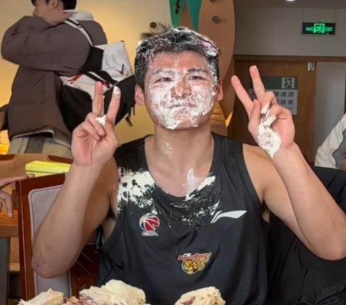 準(zhǔn)備工作做完后,主力的人員還是胡明軒、徐杰、薩姆納和杜潤(rùn)旺,他們狠狠將陳家政摁在蛋糕上。這個(gè)時(shí)候徐杰慢了一點(diǎn),他當(dāng)時(shí)還在品嘗蛋糕呢,隊(duì)友就下手了,最后才匆匆上手。