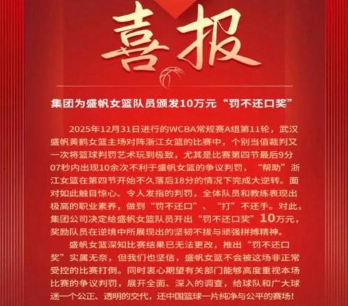 2025年12月31日WCBA第11輪,武漢盛帆女籃遭遇爭議判罰,導(dǎo)致輸給浙江女籃。賽后,武漢盛帆女籃因球員和教練在爭議判罰中保持"罰不還口""打不還手"的職業(yè)素養(yǎng),特獎勵全隊(duì)10萬元。此舉旨在肯定球員精神,同時表達(dá)對裁判工作的強(qiáng)烈不滿。