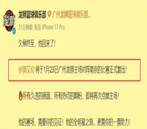 北京時間1月21日下午3點56,廣州隊正式官宣,郭艾倫將于1月23日主場對陣南京同曦隊的比賽復(fù)出,看來他的傷病已經(jīng)痊愈了。