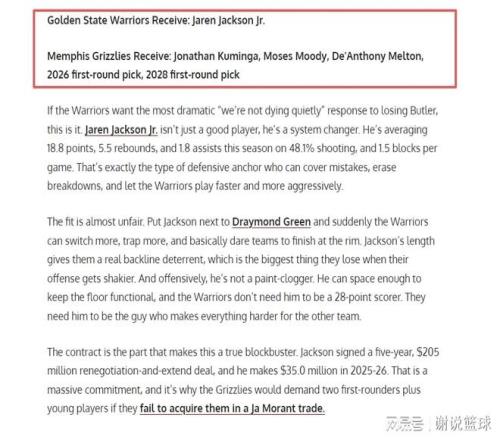那么如果同時保留庫里、巴特勒和追夢格林,勇士調(diào)整空間就很小了,不過美媒還是出謀劃策,支招勇士做5換1交易。從具體方案來看,勇士可以追求灰熊內(nèi)線小賈倫-杰克遜,只不過代價有點大,需要出三替補庫明加、穆迪和梅爾頓,再加上兩個首輪簽。