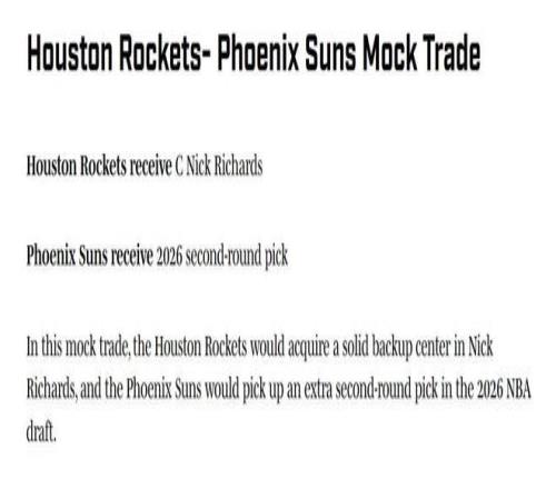 結(jié)合火箭隊(duì)的需求,美媒《體育畫報(bào)》果斷建議休城1換1拿下太陽隊(duì)的理查茲。