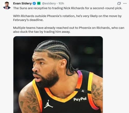 名記Evan Sidery曝出,太陽隊(duì)考慮用理查茲換一枚二輪簽,以幫助球隊(duì)徹底避開奢侈稅。