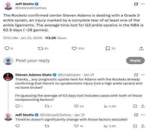 在此前火箭對(duì)陣鵜鶘的比賽中,亞當(dāng)斯腳踝扭傷退場,最終確診為三級(jí)扭傷,即至少有一根韌帶斷裂,通常需要3-6個(gè)月時(shí)間才能恢復(fù)運(yùn)動(dòng)重返賽場,目前亞當(dāng)斯的狀態(tài)也為無限期缺陣,不排除賽季報(bào)銷可能。