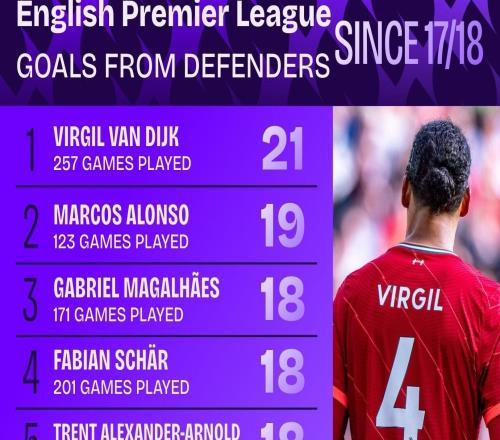 1718賽季至今英超聯(lián)賽后衛(wèi)進球榜:范戴克21球第一