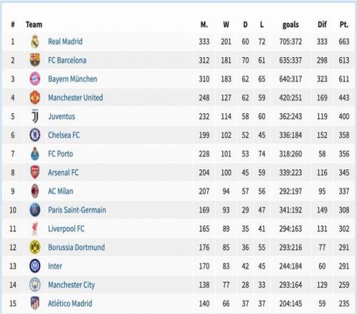 這份歐冠戰(zhàn)績榜的第15名是馬德里競技,床單軍團6次進入四強3次殺進決賽,均與冠軍失之交臂。