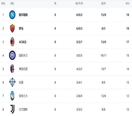 在積分榜上,那不勒斯6勝2負(fù),拿到18分,排名榜首。羅馬的戰(zhàn)績(jī)和那不勒斯一模一樣,但是因?yàn)閮魟偾蚵浜?,不得不排名?。AC米蘭5勝2平1負(fù),拿到17分,排名第3。第4的是國(guó)際米蘭,5勝3負(fù),拿到15個(gè)積分。博洛尼亞以14分排名第5??颇?3分排名第6。亞特蘭大、尤文圖斯和烏迪內(nèi)斯都是12個(gè)積分。拉齊奧贏(yíng)下這輪之后,總積分升到了11分,排名第10。