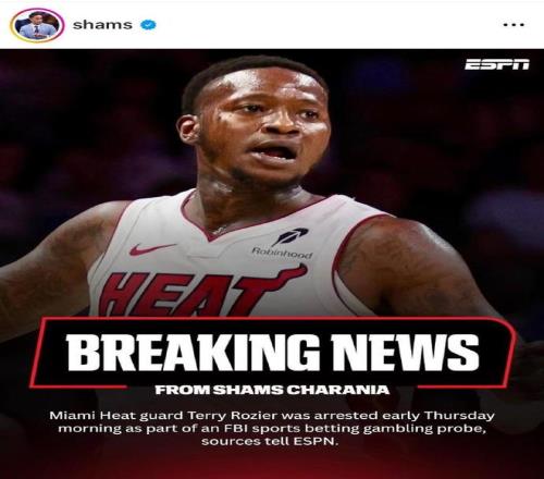 名記Shams隨后也進行了相關(guān)報道,Shams表示,熱火隊后衛(wèi)特里·羅齊爾于周四凌晨被捕,此事與聯(lián)邦調(diào)查局(FBI)體育博彩調(diào)查有關(guān)。