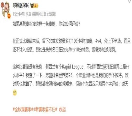 就在眾多媒體人和球迷還在熱議時間縮短的問題的時候,媒體人“球圈趙探長”又放出了猛料,表示“某聯(lián)賽”正在醞釀增加一條賽制,那就是在正式比賽結(jié)束后,兩隊的非首發(fā)球員還要留下來打10分鐘的4V4比賽,分為上下半場且不計入成績。這樣的做法,美其名曰是鍛煉輪換球員。至于這個“某聯(lián)賽”是哪個聯(lián)賽,雖然“球圈趙探長”并沒有明說,但球迷們都清楚,就是說的CBA聯(lián)賽。隨后有知情人透露,籃協(xié)方面正在商討這一做法,只不過目前還沒有最終確定。對于籃協(xié)的這個想法,“球圈趙探長”用兩個字進(jìn)行了評價:逆天!