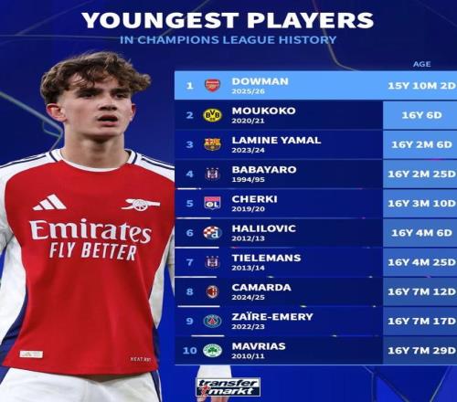 1. 道曼(阿森納) 15歲10個月2天(25-26賽季)