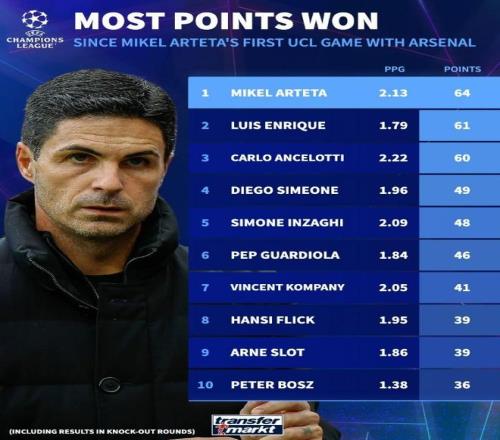德轉也盤點了自阿爾特塔執(zhí)教阿森納歐冠首秀以來,各位主帥在歐冠同期積分榜(包括淘汰賽),在跟諸多名帥對比時阿爾特塔絲毫不吃虧,列第一。他場均2.13分、總分64分分別排名第二、第一,不管是哪個層次來看都是在名帥級別的。