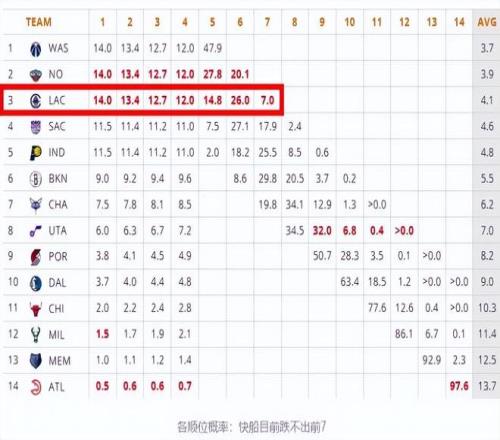今天NBA迎來一場焦點(diǎn)對決,洛杉磯快船隊客場113-115惜敗火箭隊,此役過后快船戰(zhàn)績跌至6勝19負(fù)排在西部倒數(shù)第二,全聯(lián)盟排名倒數(shù)第三!熟悉NBA規(guī)則的小伙伴都應(yīng)該明白,一支球隊的戰(zhàn)績將最終決定該球隊在下一個休賽期的選秀權(quán)位次。此役過后快船獲得下個休賽期狀元簽概率達(dá)到了14%,與奇才、鵜鶘并列聯(lián)盟第一,按照目前這種局面快船最差簽位都跌不出聯(lián)盟前7!