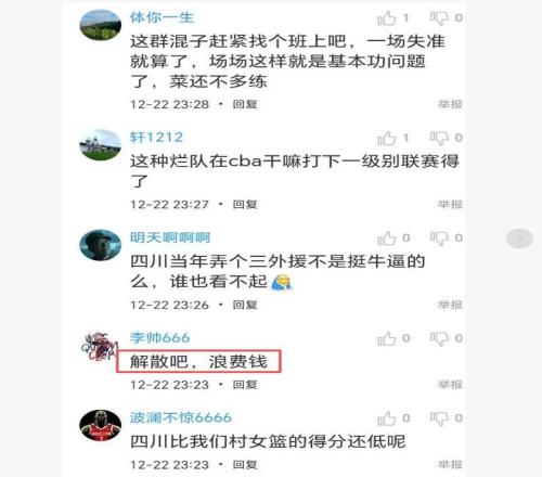 不過四川隊擺爛是有原因的,那就是他們近兩年資金鏈緊張、頻頻欠薪,俱樂部投資人因為債臺高筑身陷囹圄,俱樂部內(nèi)憂外患,球員士氣低迷,最終在主場遭遇了一場載入史冊的慘敗。球迷也是為四川隊感到嘆息,“唉,沒錢就啥也不行了”、“這樣的球隊留在CBA沒有意義”、“解散吧,浪費錢”了。不知四川隊還能挺多久?不解散也得盡快出賣了吧。你們說呢?