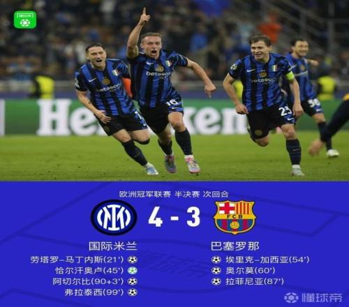 歐洲冠軍聯(lián)賽半決賽次回合,國際米蘭與巴塞羅那展開激烈較量。上半場,鄧弗里斯橫傳助攻勞塔羅推空門得手,勞塔羅造點(diǎn)后恰爾汗奧盧主罰命中;下半場,阿切爾比俯身頭球入網(wǎng)被判越位進(jìn)球無效,馬丁助攻加西亞凌空墊射破門,馬丁再度助攻奧爾莫頭球扳平,拉菲尼亞連續(xù)兩腳攻破球門逆轉(zhuǎn)比分,補(bǔ)時(shí)階段鄧弗里斯助攻阿切爾比將比分扳平;加時(shí)賽階段,塔雷米背身助攻弗拉泰西打遠(yuǎn)角破門。最終,國際米蘭以4-3戰(zhàn)勝巴塞羅那。兩回合總比分國際米蘭7-6淘汰巴塞羅那,成功晉級(jí)決賽。