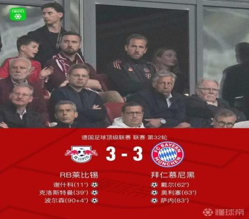 德甲聯(lián)賽第32輪,RB萊比錫主場對(duì)陣拜仁慕尼黑。上半場,謝什科建功,克洛斯特曼破門幫助萊比錫建立兩球領(lǐng)先優(yōu)勢;下半場,比賽信號(hào)一度中斷,戴爾頭球破門扳回一城,奧利塞迅速扳平比分,薩內(nèi)抽射破門反超比分,但比賽最后時(shí)刻波爾森上演絕平。最終,拜仁在客場苦戰(zhàn)中,3-3戰(zhàn)平萊比錫,凱恩的首冠因而繼續(xù)推遲。
