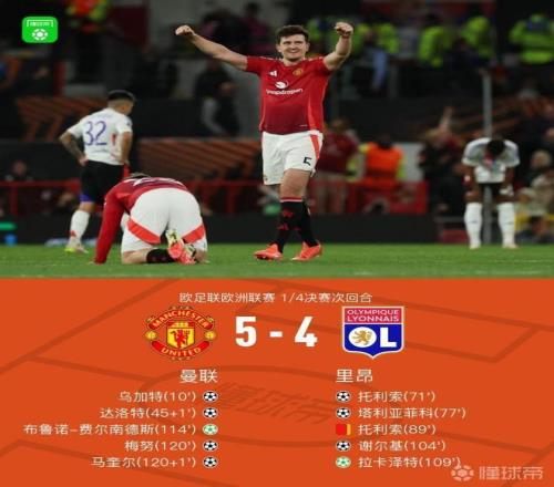 歐聯(lián)1/4決賽次回合,曼聯(lián)與里昂展開對(duì)決。上半場,烏加特和達(dá)洛特先后破門為曼聯(lián)取得兩球領(lǐng)先。下半場,托利索和塔利亞菲科6分鐘內(nèi)扳平比分,托利索隨后吃到第二張黃牌被罰下。90分鐘戰(zhàn)罷,兩隊(duì)?wèi)?zhàn)平進(jìn)入加時(shí)賽。加時(shí)賽,謝爾基破門,拉卡澤特點(diǎn)射得分。不過隨后比賽進(jìn)入最高潮,先是B費(fèi)點(diǎn)球扳回一城。隨后,梅努完成絕平??ㄈ琢_傳中,馬奎爾頭槌絕殺。全場比賽結(jié)束,曼聯(lián)加時(shí)賽連進(jìn)三球5-4逆轉(zhuǎn)擊敗里昂,并且以兩回合7-6的總比分晉級(jí)歐聯(lián)4強(qiáng)。