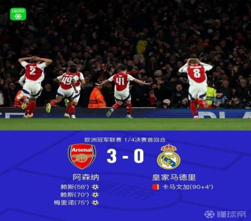 北京時(shí)間4月9日,阿森納坐鎮(zhèn)酋長球場迎戰(zhàn)皇家馬德里。上半場帕爾特伊遠(yuǎn)射被撲,姆巴佩單刀打高,隨后姆巴佩打門被拉亞撲出,賴斯和馬丁內(nèi)利打門被庫爾圖瓦神勇?lián)涑?,下半場賴斯神?jí)任意球破門,庫爾圖瓦屢次撲救救險(xiǎn),賴斯天外飛仙任意球梅開二度,梅里諾兜射死角鎖定勝局,卡馬文加兩黃變一紅被罰下。最終比分阿森納3-0皇馬。