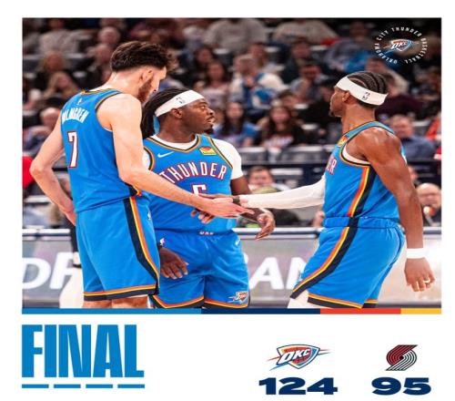 亞歷山大再一次三節(jié)打卡下班,28分鐘,15中11,三分2中1,罰球7中7,拿到30分6助攻2籃板4搶斷,命中率73.3%,三分命中率50%,真實命中率83%,正負值+22,本賽季他第16次三節(jié)打卡,只有17場比賽打了第四節(jié)。